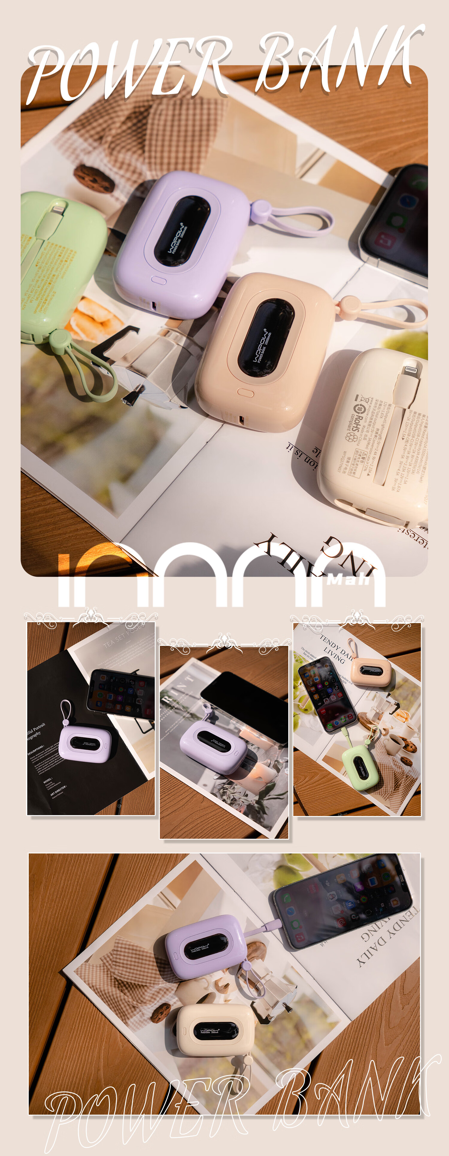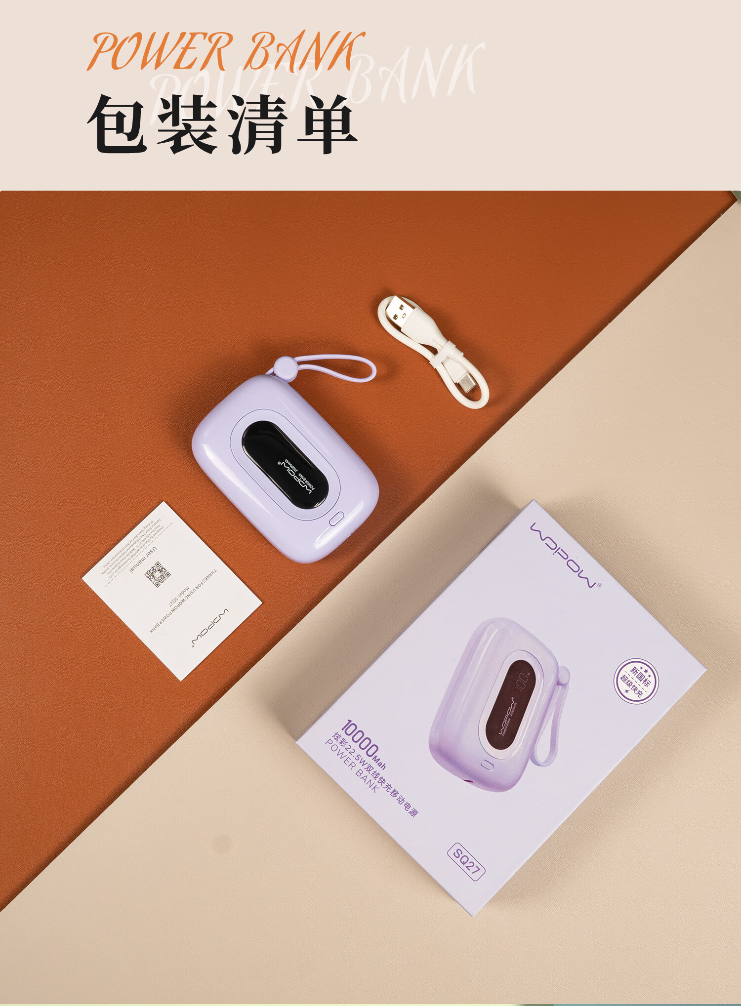 沃品(WOPOW)22.5W超级快充移动电源充电宝自带双线迷你蓄电10000毫安适用苹果华为小米手机 油白*22.5W快充*1W毫安
