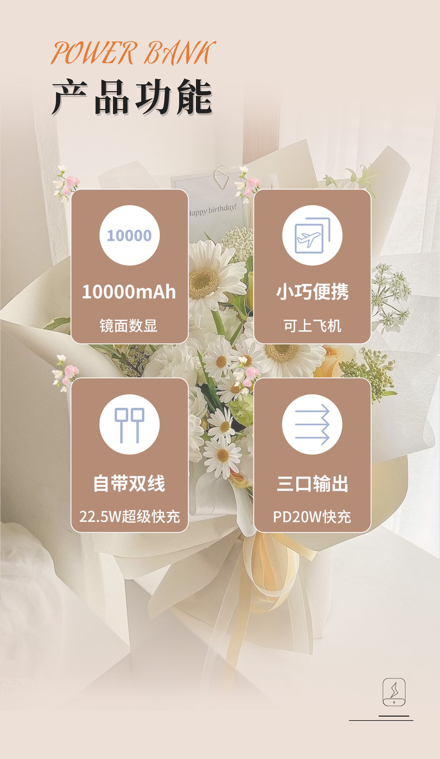 特色功能:PD快充,自带线,TYPE-C输入