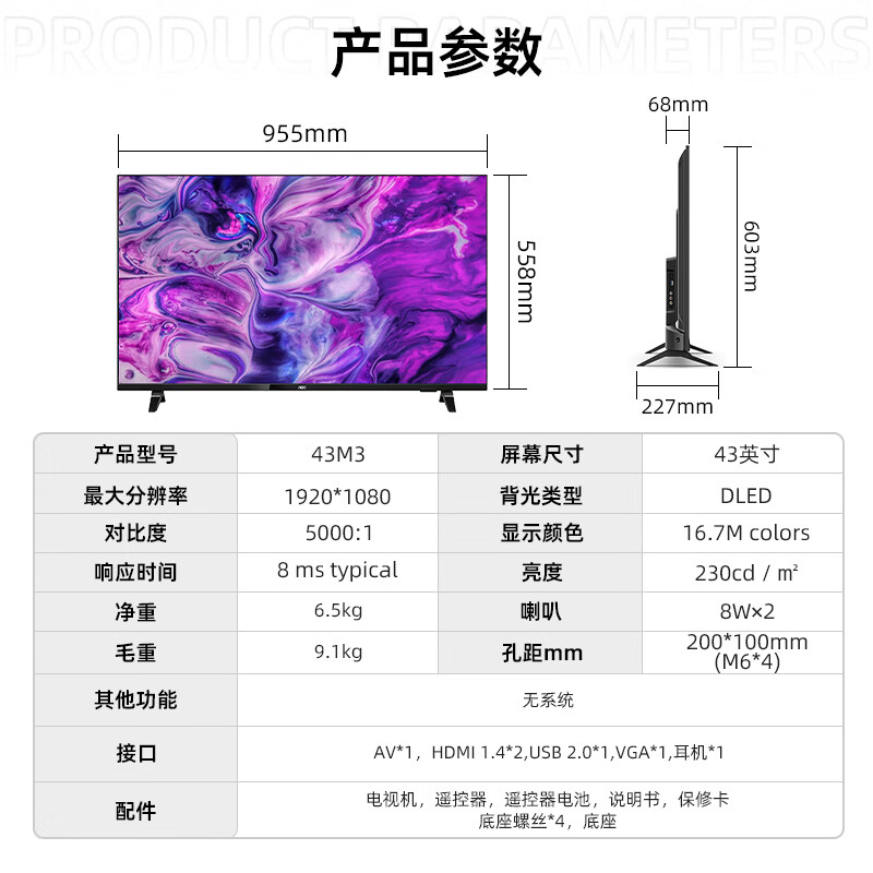 遥控器× 1,遥控器电池× 1,使用说明书× 1,保修卡× 1,底座× 1 (每个型号包装清单不同,详情可咨询在线客服)