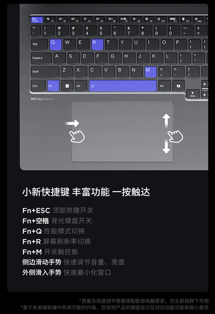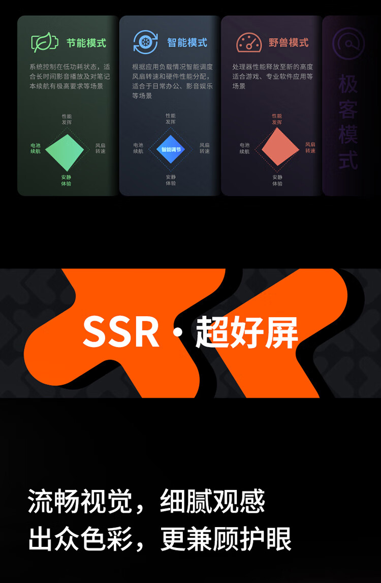| 特色快捷键 | Fn+Q智能散热调节(智能模式/节能模式/野兽模式),Fn+ESC 顶部热键开关,Fn+空格 背光键盘开关,Fn+R屏幕刷新率切换,Fn+M开关触控板 |