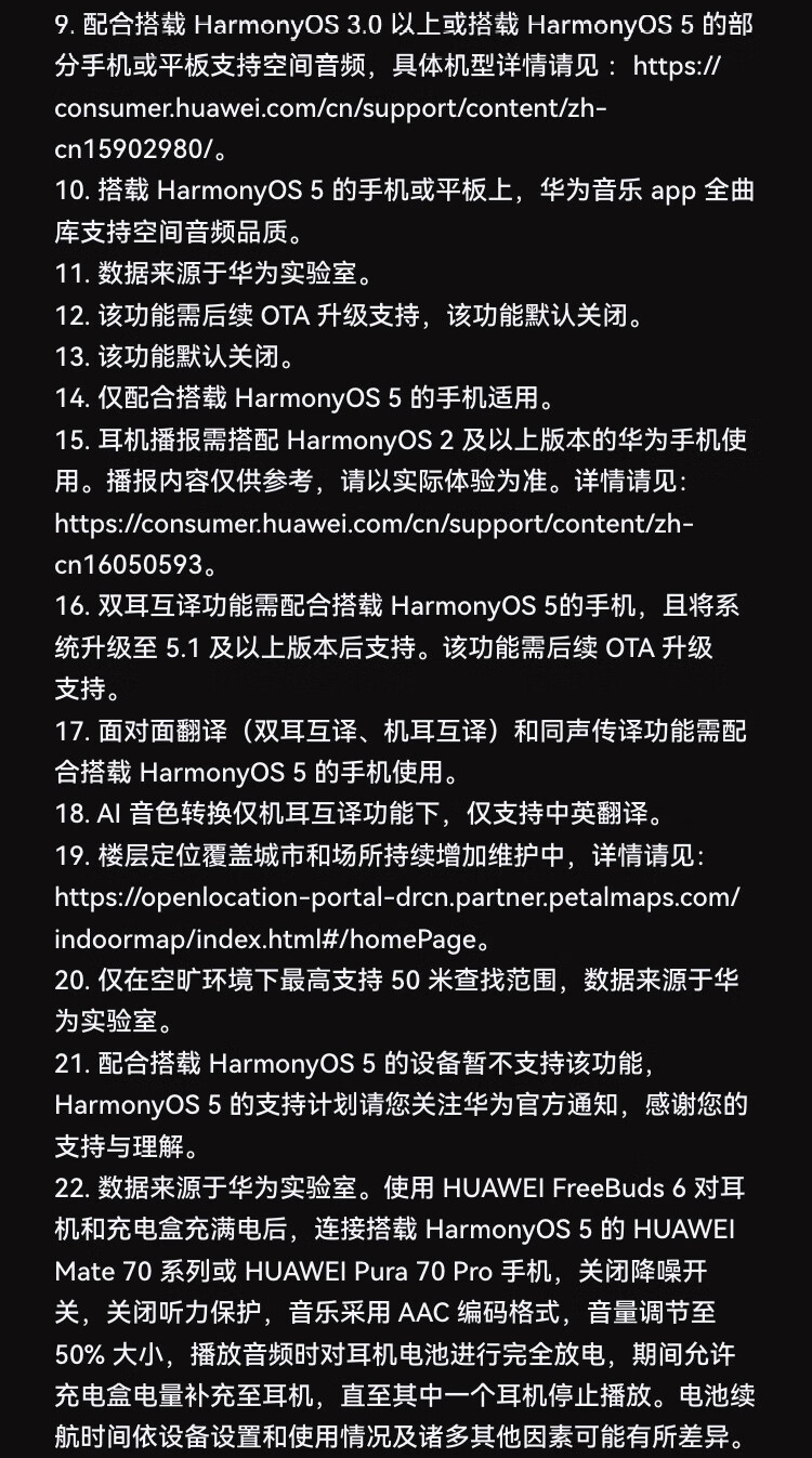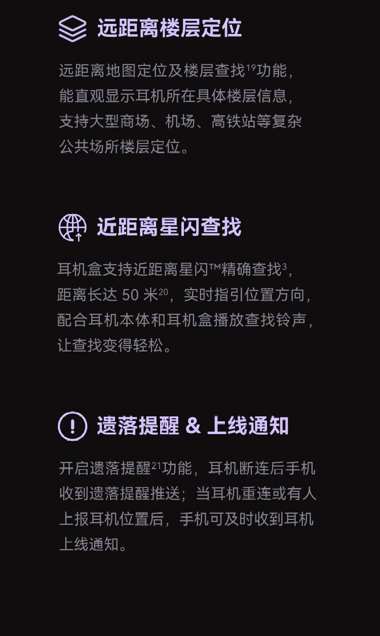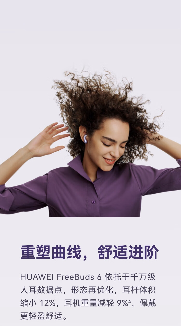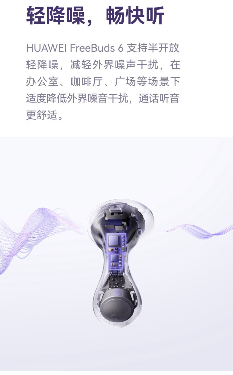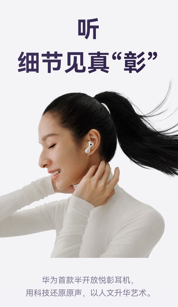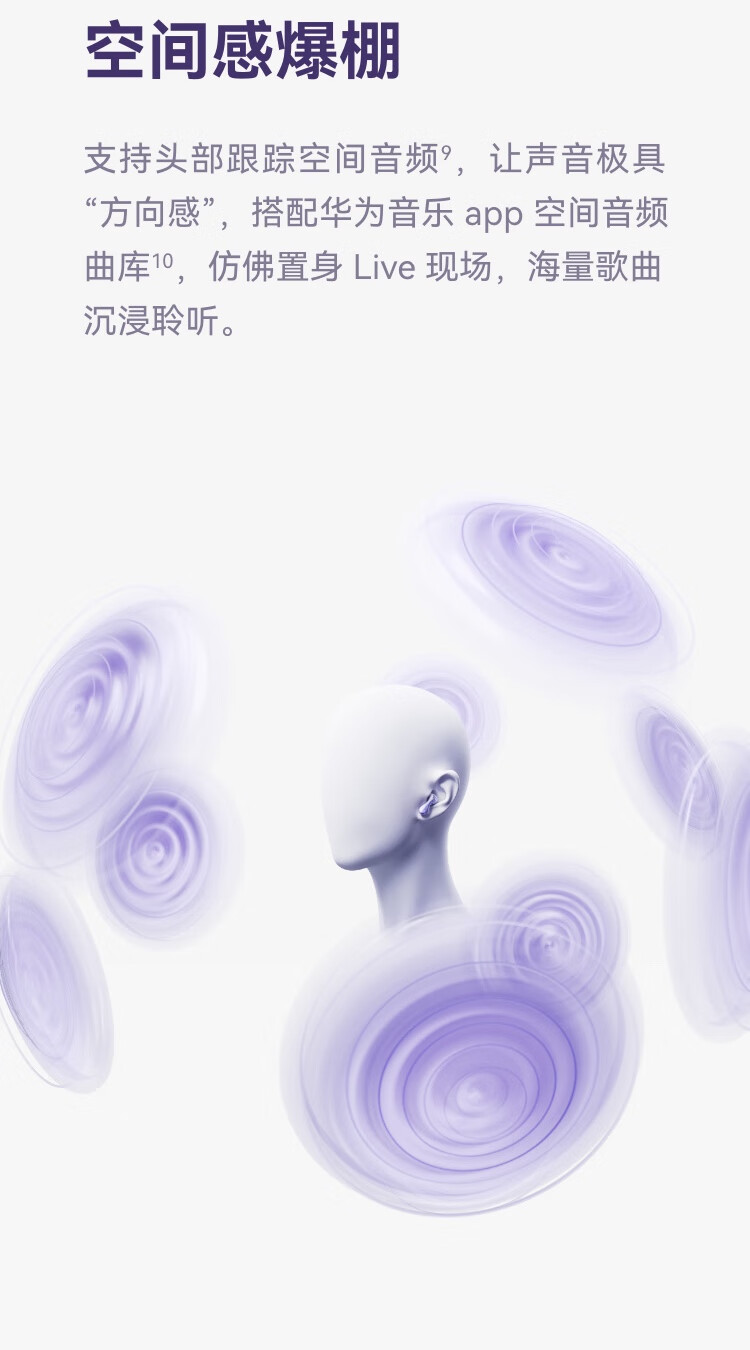 | 配置 | 外包装采用塑封,彩盒内标配:耳机 × 2(左右耳各1);充电盒 × 1;快速指南&安全信息(含保修卡)× 1;USB-C充电线 × 1(长度:约23cm);华为音乐权益卡 × 1;耳套 × 4(左右耳各2) |